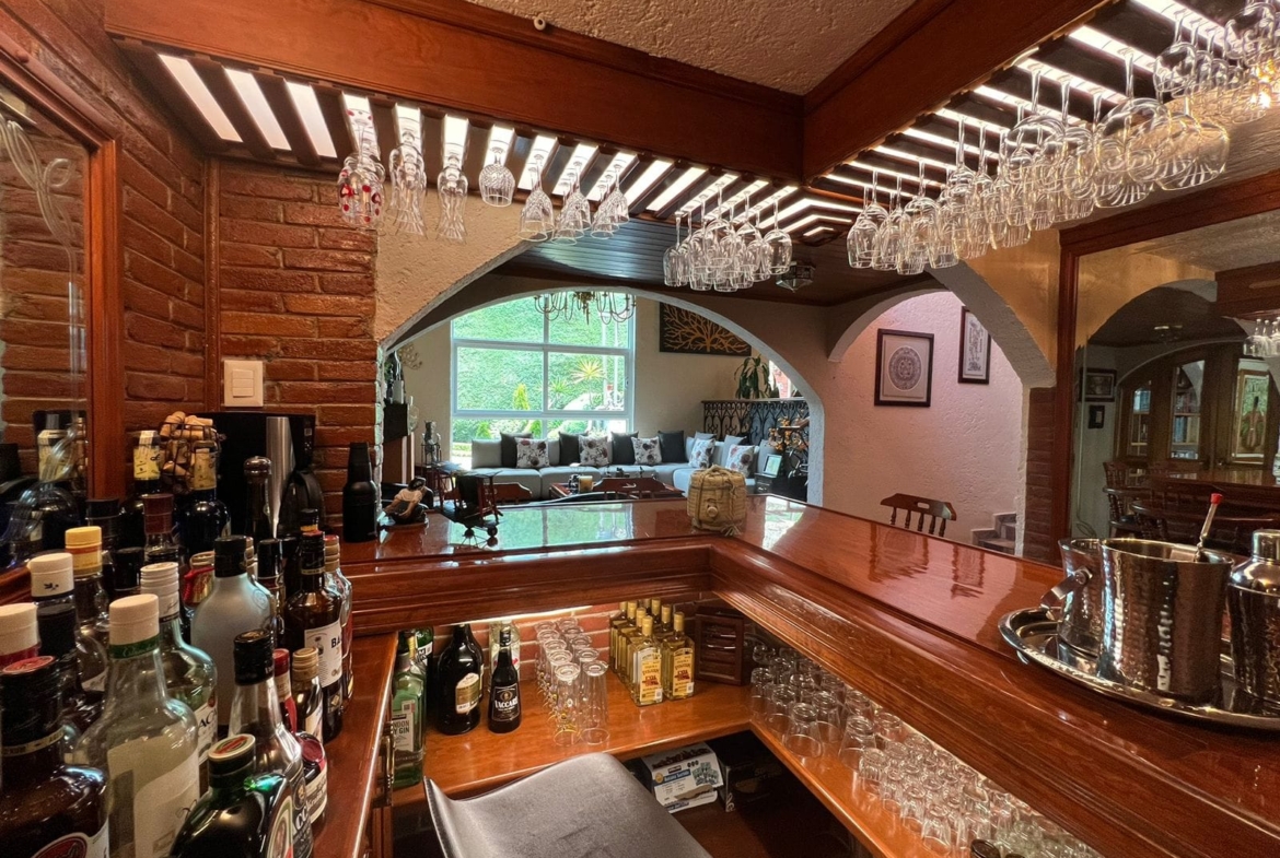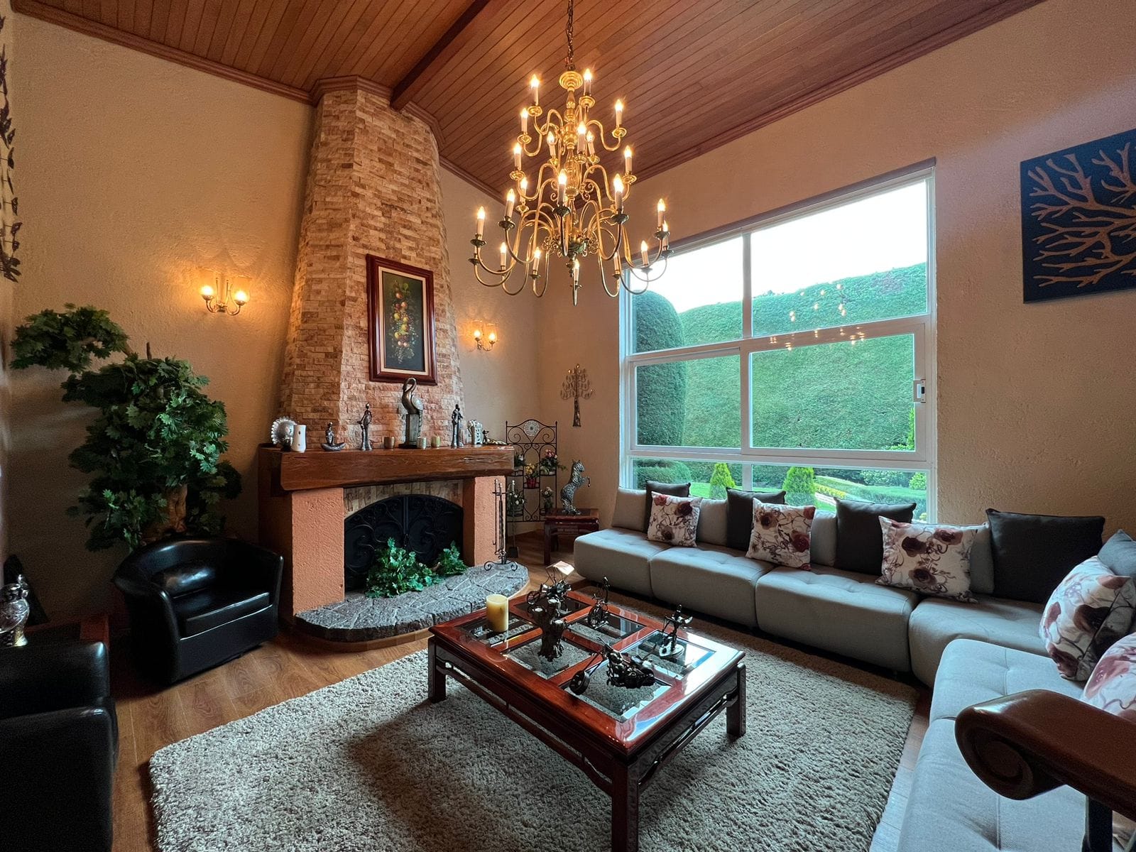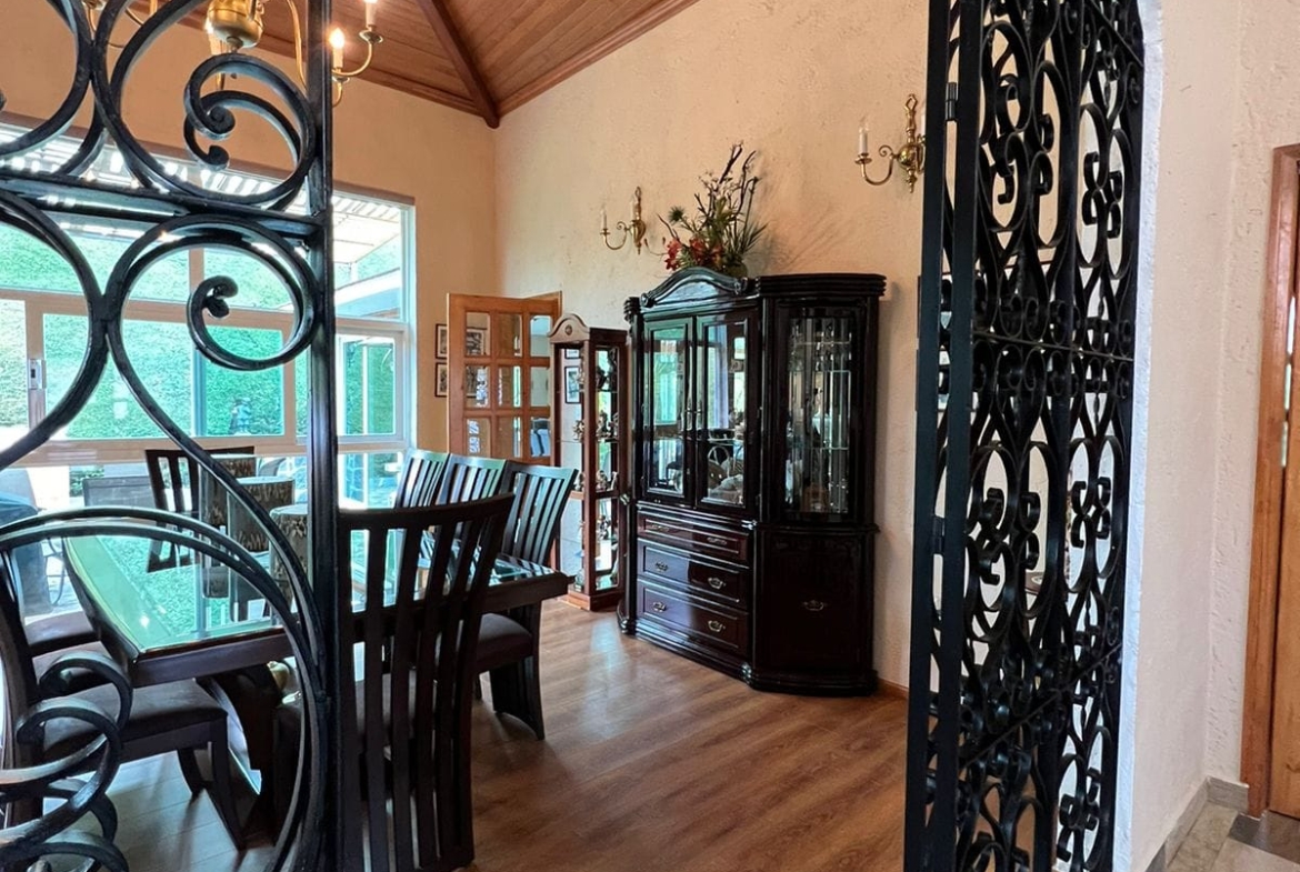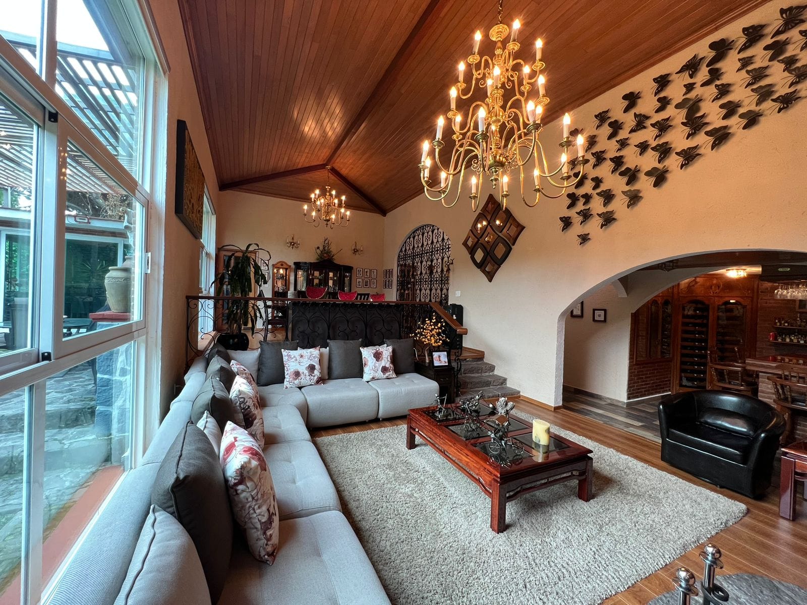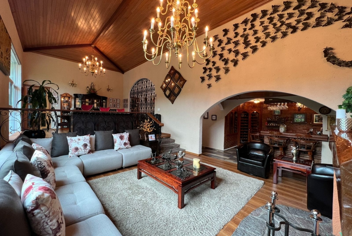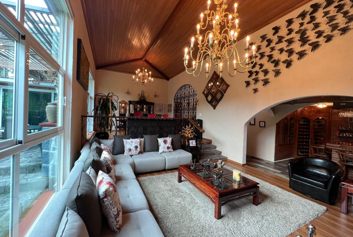 • Sala y comedor a doble altura con acabados de madera y candiles